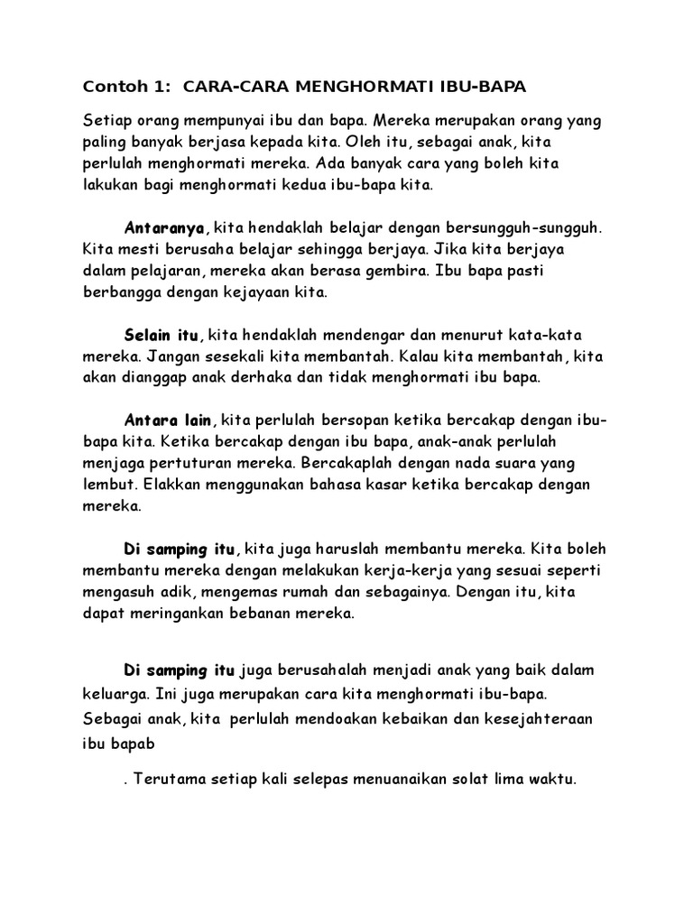 Contoh karangan cara cara menghormati ibu bapa. Begitulah pengorbanan ibu bapa yang tiada tandingannya dengan sesiapa pun jua. Kita mestilah mengerjakan solat sebanyak lima waktu sehari iaitu solat pada waktu subuh zohor asar maghrib dan isyak.